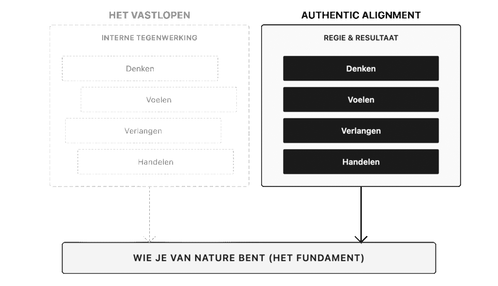 Gaandeweg werd het voor mij helder dat duurzame beweging doorgaans niet ontstaat door optimaliseren of corrigeren alleen, maar door het verminderen van interne tegenwerking. Vanuit dat inzicht is het Authentic Alignment-kader ontstaan: een analytische benadering om samenhang en interne tegenwerking in functioneren zichtbaar te maken.